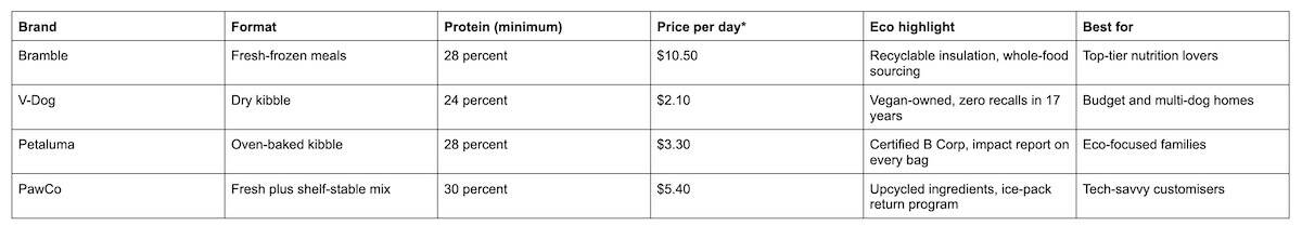 The table below compares the four vegan dog food delivery services side by side so you can spot key differences at a glance.